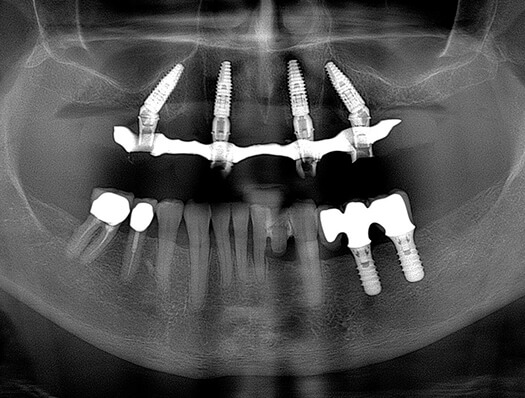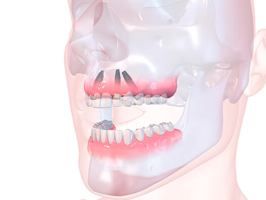 Mit der All-on-4TM-Methode lässt sich festsitzender Zahnersatz mit nur vier Implantaten pro Kiefer verwirklichen. Dank des technologischen Fortschrittes können Sie eine provisorische, perfekt passende All-on-4-Brücke innerhalb von ein paar Stunden erhalten. Die definitive Brücke wird dann nach der Einheilung der Implantate hergestellt.